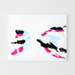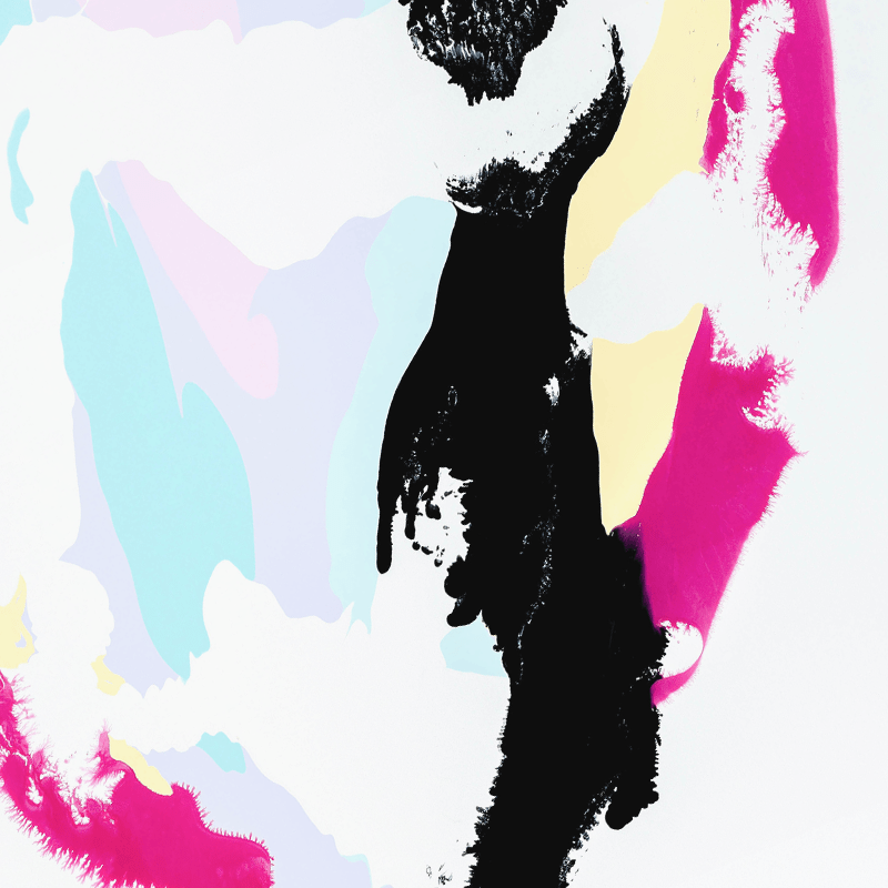 “Frisked” striking composition juxtaposes bold, ink-black paint against a pastel dreamscape, crafting an alluring tension that both invites contemplation and celebrates the unpredictable beauty of abstract expressionism.